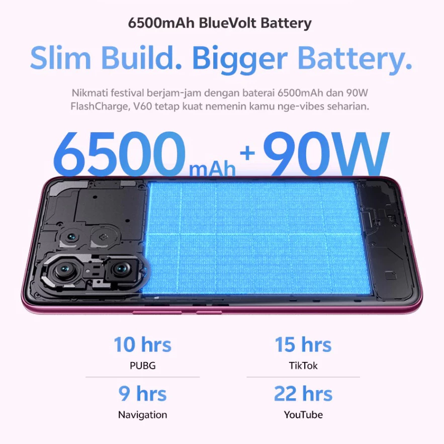 * Baterai 6500 mAh berteknologi BluVolt dengan pengisian daya cepat 90 Watt